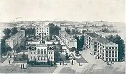 Auf dem Gelände des Stifts errichtete Riedel für über 40.000 Mark ein Lehrgebäude, das am 3. Oktober 1904 eröffnet wurde.[37][38] In diesem Gebäude sollten nach Riedels Willen Vorträge über Volkswirtschaft stattfinden. Die Vortragenden sollten mit 50 Mark vergütet werden. Die Gelder dafür stammten aus den Zinsen von weiteren 25.000 Mark, die Riedel stiftete. Zudem befanden sich in dem Gebäude eine Bibliothek und zwei Wohnungen, die kostenlos Mitgliedern von Riedels Familie zur Verfügung standen. Sie sollten dafür unter anderem die Bibliothek verwalten.[37]
