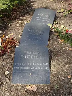 Wilhelm Riedel starb am 23. Januar 1916 in Berlin. Er wurde im Ehrengrab der Familie auf dem Cottbuser Südfriedhof bestattet.[41] Dorthin hatte er schon seine Eltern umbetten lassen. Auch das Grab seiner Frau Auguste, die 1899 gestorben war, befindet sich dort.[42]