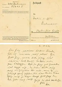 Noch am Vortage seiner Verlegung an die Ostfront schilderte er seiner Frau den Tag des Abschieds: „… Zwar wusste ich im ersten Augenblick selber nicht, was größer in mir war, die Wut gegen die höhere Gewalt, die mich von Euch trennt, oder die Sehnsucht nach Dir und den Kindern.“ „So fahre ich denn morgen in der Gewissheit, dass ich drei liebe Menschen daheim habe, die mich lieben und für die es sich lohnt, wenn es sein muss, auch zu sterben.“[34] Der Schriftverkehr zwischen den Eheleuten war die einzige Möglichkeit des Kontaktes. Das geteilte Familienleben war geprägt von dieser Trennung. Die Briefe dokumentierten den festen Glauben beider Eheleute an einen barmherzigen Gott. Seine Briefe schrieb er nun direkt von der Front. „Gestern ging den ganzen Tag die Losung und der Lehrtext mit mir, Jesaja 45 und Johannes 14, eine ausgezeichnete Zusammenstellung.“ „Solltest Du einmal, was Gott verhüten möge, mit den Kindern allein sein, so ist diese Losung und dieser Lehrtext mein Vermächtnis an Dich.“[35]