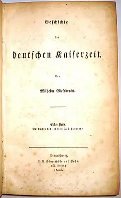 Nach mehr als zwanzigjährigen Vorarbeiten schritt er an die Ausarbeitung seines Hauptwerkes, der Geschichte der deutschen Kaiserzeit (Braunschweig 1855 ff), die mit dem 1880 erschienenen 5. Band bis zum Jahr 1164 gelangt war, während die zwei ersten Bände bereits die 5. Auflage erlebt hatten. Vor allem der erste, 1855 erschienene Band fand durch seine publikumswirksame Erzählweise und durch gründliche Forschung allgemeinen Beifall. Auch die weiteren Bände zeichnen sich durch gewissenhafte Analyse der Quellen und geistvolle Charakteristiken aus, wenn sie auch manchmal zu sehr ins Detail gehen und statt eines eigenen Standpunkts einfach die verschiedenen Auffassungen über Streitfragen wiedergeben.