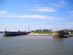 Als Verbindung des Binnenhafens zur Nordsee sind vier Seeschleusenanlagen gebaut worden, von denen nur noch eine in Betrieb ist. Diese Anlagen werden als I. bis IV. Einfahrt bezeichnet.[13] Die I. Einfahrt ist die als zweites gebaute Schleusenanlage und wurde anfangs als Neue Einfahrt bezeichnet. Sie wurde zwischen 1875 und 1886 mit einer einzelnen Schleusenkammer gebaut und bildete zugleich den Ausgang des Ems-Jade-Kanals zur Jade. Nach der Fertigstellung der III. Einfahrt wurden 1909 die Einfahrten durchnummeriert, und die Neue Einfahrt erhielt die offizielle Bezeichnung I. Einfahrt.[15]