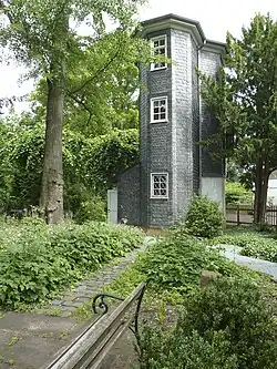 - ↑ Plakette am Gartentor des Grundstücks mit Besucherinformationen, Foto auf Wikimedia Commons