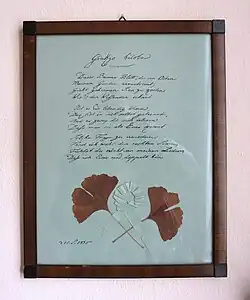 Die beiden Obergeschosse sind ebenfalls im Stil des Klassizismus eingerichtet und in der Art von Wohnräumen des 19. Jahrhunderts mit Tapeten, Gardinen und Möbeln ausgestattet. Die Möblierung der Obergeschosse besteht aus einem Paar Stühlen mit kleinem Tisch, einem Sekretär, Marianne von Willemers Toilettentisch[4] sowie einer kleinen Anzahl von Schauvitrinen. An den Wänden hängen gerahmte Bilder mit verschiedenen Porträts von Goethe und Willemer, mit Briefkopien sowie mit einigen zeitgenössischen Frankfurter Landschaftsdarstellungen, darunter Darstellungen des originalen Gartenhäuschens und der Gerbermühle. Ein besonderes Ausstellungsstück ist ein Faksimile des Papierbogens mit dem handschriftlich aufgezeichneten Gedicht Gingo biloba, das Goethe im Jahr 1815 mit zwei Ginkgo-Blättern verziert Marianne von Willemer gewidmet hatte (siehe nebenstehendes Foto).
