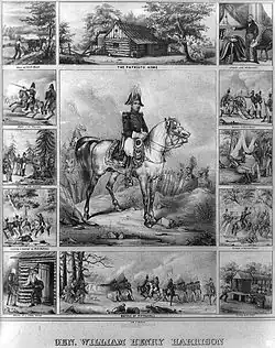 An dieser Stelle kam nun Harrison ins Spiel und im Januar 1835 schlug ihn in Harrisburg, Pennsylvania, eine erste Whig-Versammlung als Präsidentschaftskandidaten vor.[137] Nachdem in Neuengland Daniel Webster, in den Südstaaten Hugh Lawson White als Kandidaten auserkoren wurden und Ohios Favorit, der oberste Bundesrichter John McLean, passiv geblieben war, streuten Harrisons Anhänger Anfang 1835 seinen militärisch ruhmvollen Namen als Kandidaten für den Nordwesten und eines Tages die Nation insgesamt. Neben seiner verblassten Prominenz aus vergangenen Tagen und der hohen Anhängerschaft unter den zahlreichen Veteranen[138] gereichte ihm zum Vorteil, dass er als Politiker kaum einen bleibenden Eindruck jenseits von Indiana-Territorium und Ohio hinterlassen hatte, vor allem nicht in der brisanten, Clay zum Nachteil gereichenden Sklavenfrage,[139] sondern fast ausschließlich als General im Krieg von 1812 in der Erinnerung präsent war. Er war daher als politisch weitgehend unbeschriebenes Blatt für bedeutende Wählergruppen wie zum Beispiel die Pflanzer und den einflussreichen Anti-Freimaurer-Flügel eine akzeptable Alternative zu polarisierenden Figuren wie Webster und dem Freimaurer Clay. Dessen Verhältnis zu Harrison hatte sich merklich abgekühlt, aber er unterstützte ihn als Kandidaten mit dem größten Potenzial, die Partei zu einigen.[140] Im Dezember 1835 wählte ihn in Pennsylvania der erste Parteitag zum Whig-Kandidaten für ihren Einzelstaat.[141]