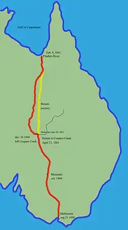 Die Gruppe mit Burke und Wills erreichte am 11. November den 400 Meilen entfernten Cooper Creek und wollte dort auf die nachfolgende Gruppe warten. Während dieser Pause entschied sich Burke, einen Abstecher zum Golf von Carpentaria zu machen, und brach gemeinsam mit Wills, John King und Charley Gray auf. Die restlichen Männer ließ er unter dem Befehl von William Brahe zurück. Burke, Wills und ihre Begleiter erreichten am 9. Februar 1861 die Mangroven an der Flussmündung des Flinders River. Strömender Regen und Sümpfe verhinderten jedoch, dass sie den Ozean zu Gesicht bekamen.
