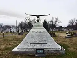 Branhams Lehrtätigkeit endete abrupt, als ein betrunkener Autofahrer am 18. Dezember 1965 auf dem Highway 60 in Texas frontal mit seinem Fahrzeug zusammenstieß. Die Familie befand sich auf dem Weg nach Jeffersonville, wo sie die Weihnachtsfeiertage verbringen wollte.[306] Branham und seine Ehefrau erlitten schwere Verletzungen. Nach einem sechstägigen Koma verstarb Branham in einem Krankenhaus in Amarillo.[29] Der Beerdigungsgottesdienst wurde am 29. Dezember gehalten, sein Leichnam jedoch erst am 11. April 1966 (Ostermontag) auf dem Ostfriedhof in Jeffersonville bestattet, da seine Anhänger die Auferstehung Branhams zu Ostern erwarteten.[307] Der Grabstein besteht aus einer Marmorpyramide mit einem Adler auf der Spitze,[308] Symbole, denen er große Bedeutung beimaß.[309] Die Frontseite der Pyramide wurde mit einer aufgeschlagenen Bibel und den Zitaten aus Maleachi 4,5 (bzw. 3,23) und Offenbarung 10,7 versehen, die Branham auf sich bezog; auf der Rückseite stehen die Worte seines vermeintlichen Sendungsauftrages. Auf den zwei anderen gegenüberliegenden Seiten befindet sich eine Auflistung der sieben Gemeindezeitalter und der ihnen zugewiesenen Propheten, von denen Branham an oberster Stelle steht.