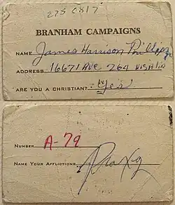 Branham wurde dafür bekannt, dass er die Krankheit des Patienten erkannte, noch ehe ihm diese mitgeteilt wurde.[174] Anhänger Branhams unterschlagen oft die Tatsache, dass nummerierte Gebetskarten (Prayer Cards) zum Einsatz kamen, auf die jeder Patient im Vorfeld einer Heilungsveranstaltung seinen Namen, seine Adresse und seine Krankheit aufschreiben musste, ehe er sich in die sogenannte Prayer Line stellen durfte.[175] Die Karten wurden von Branhams Bruder und in späteren Jahren von seinem Sohn Billy Paul eingesammelt und die Patienten einzeln nach ihrer Nummer auf die Bühne gebeten, wo Branham für sie betete.[176] Hierbei überraschte Branham das Publikum dann damit, dass er die Namen, den Wohnort und die jeweilige Krankheit des Patienten benennen konnte, ohne mit diesen gesprochen zu haben.[176] Dieser Trick des vermeintlichen Hellsehens mittels zuvor ausgefüllter Karten wurde in dem 1946 erschienenen und ein Jahr später verfilmten Roman Nightmare Alley thematisiert, also in eben den Jahren, in denen William Branham seine Karriere als Geistheiler begann.[177] Branham sagte, dass er seine Fähigkeit als Heiler nur anwenden könne, wenn der Engel anwesend sei, der ihn seit seiner Kindheit begleite.[178][179][180] Wenn er den Engel nicht an seiner Seite wahrnahm, brach er die Veranstaltungen augenblicklich ab.[181] In den gelegentlich sehr spontanen Abbrüchen der Heilungsgebete, die mit der Abwesenheit des Engels oder einem Schwächeanfall begründet wurden, sehen Kritiker eine einfallsreiche Verschleierungstaktik Branhams, die zur Anwendung kam, wenn er sich nicht mehr an den Inhalt der Gebetskarten erinnern konnte.[182] Die Tonaufzeichnungen der Heilungsveranstaltungen belegen, dass Branham von Zeit zu Zeit sehr unspezifische Aussagen machte oder sogar die Vornamen seiner Patienten nicht kannte.[183] Dies war einer der Gründe, warum die Patienten dazu angehalten wurden, ihre Position in der Gebetsreihe nicht zu ändern oder anstelle eines anderen auf die Bühne zu kommen.[184]