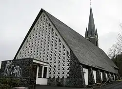 Lediglich der Turm der 1902 erbauten Kirche steht unter Denkmalschutz. Es handelt sich um einen aus regionalen Basaltsteinen errichteten Viereckturm mit auffällig hohem Spitzhelm. Ecktürmchen und Wichhäuser schmücken das Dach zusätzlich. Adresse: Kirchstraße 4.