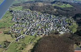 Luftaufnahme des Orts aus Richtung Nordwesten. Am oberen Bildrand rechts das Plateau der Dornburg (mit den Resten des Oppidums), in der Mitte der ehemalige Steinbruch.