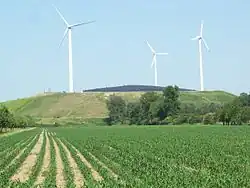Zwischen 1999 und 2003 wurden drei Windkraftanlagen auf dem Windmühlenberg installiert. Die beiden ersten Anlagen hatten eine Leistung von jeweils 750 kW, die dritte 1.500 kW.[4] Um die Windstromproduktion zu erhöhen, wurden die beiden kleineren Anlagen durch eine größere Anlage vom Typ Senvion (2.000 kW) ersetzt.[5] Am Südhang errichteten die Stadtwerke Karlsruhe 2005 außerdem eine große Photovoltaikanlage. Des Weiteren wird das Deponiegas, das durch die Zersetzung des Mülls entsteht, seit 1997 in Blockheizkraftwerken verbrannt. Da allerdings auf der Deponie kein neuer Abfall mehr abgelagert wird, nimmt die Entwicklung von Deponiegas und damit auch die Energieerzeugung stetig ab. Insgesamt werden heute auf dem Energieberg pro Jahr rund 10 Millionen kWh Strom regenerativ erzeugt. Zusätzlich werden über ein Nahwärmenetz die Betriebs- und Bürogebäude auf der Deponie sowie ein nahegelegenes Straßenbahndepot versorgt.[6]