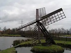 Im 16. Jahrhundert wurden schließlich erstmals Mühlen mit einer drehbaren Haube eingesetzt, die sogenannte Holländerwindmühlen. Diese wiesen eine höhere Leistung auf und trugen damit dem gestiegenen Bedarf an Pumpleistung Rechnung.[5] Während Holländerwindmühlen im Rest von Europa vorwiegend als Getreidemühlen eingesetzt wurden, war ihr Haupteinsatzzweck in den Niederlanden die Entwässerung.[6] Da jedoch beim Trockenlegen von Landstrichen häufig die Leistung einer einzelnen Anlage nicht ausreichte, wurden die Windmühlen in Gruppen konzentriert, was als Vorläufer der heutigen Windparks gesehen werden kann.[7]