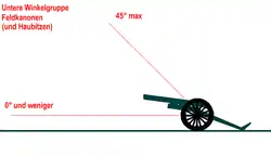 Die maximal mögliche Schussweite ergibt sich dabei bei einem Erhöhungswinkel von 45° zur Horizontalen (bei Nichtberücksichtigung des Luftwiderstandes). Wird ein Ziel beschossen, dessen Entfernung unterhalb der maximalen Schussweite liegt, gibt es zwei mögliche Lösungen für die Feuerleitgleichung. Die Lösung mit Erhöhung über 45° (und unter 90°) wird als Resultat in der oberen Winkelgruppe, die Lösung mit Erhöhung zwischen 0° und 45° als Resultat in der unteren Winkelgruppe bezeichnet.
