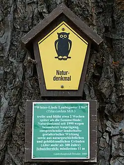 - ↑ a b c Verordnung der Landeshauptstadt Dresden zur Festsetzung des Naturdenkmales „Winter-Linde Laubegaster Ufer“. Vom 10. Juni 1999. In: Dresdner Amtsblatt. Nr. 33, 19. August 1999, S. 11 f. (Digitalisat [PDF; 1,4 MB]).