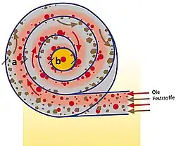 - Die zentrifugale und zentripetale Kraft: Während sich schwere Partikel zentrifugal nach außen zum Rand der Leitwände hin bewegen und absetzen, strömen gleichzeitig Leichtflüssigkeiten zur Mitte, zu den Innenwänden hin, also zentripetal gerichtet.