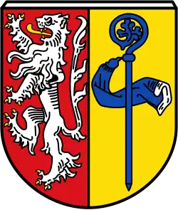 Blasonierung: „Gespalten von Rot und Gold; vorn ein goldbewehrter, goldgezungter silberner Löwe, hinten ein blauer Abtsstab mit abflatterndem blauem Velum.“ |