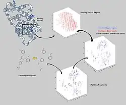 Die Struktur des Liganden kann auch im Zuge einer Modellierung in die Formen seiner Bestandteile (Formmotive) unterteilt werden, die auch als Fragmente bezeichnet werden.[12] Durch aufeinanderfolgendes Hinzufügen auf das erste Fragment (engl. seed ‚Keimling‘) wächst die Größe des so entworfenen Liganden. Zwar gibt es nur wenige Fragmente, jedoch können durch deren Kombination viele verschiedene Moleküle erzeugt werden. Zur Ermittlung der potenziellen Energiefläche werden mit Großrechnern die freie Energie der jeweiligen Bindung berechnet, um die niedrigste potentielle Energie zwischen der Bindungsfläche und dem Pharmakophor zu identifizieren. Zur Einsparung von Rechnerzeit und -kapazitäten werden die Schritte priorisiert, z. B. werden fest bindende Fragmente bei der Berechnung bevorzugt. Nach Ermittlung bindenender Fragmente für mehrere Bindungsstellen werden diese zu einem Molekül vereinigt. Die Konformation niedrigster potenzieller Energie ermöglicht eine höher affine Bindung des Liganden.[9][10][13]