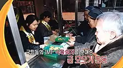 Vom 5. Januar bis zum 30. April 1998 führte der öffentlich-rechtliche Rundfunkanstalt KBS eine nationale Kampagne, damit die Bürger Gold spenden, um so einen Teil der massiv gestiegenen staatlichen Schulden zurückzuzahlen. Es sollen 3,49 Millionen Menschen insgesamt 225 Tonnen Gold gespendet haben.[56] Die großen Konzerne stießen ineffiziente Teilbereiche ab und begannen sich auf die jeweiligen Kernbereiche zu konzentrieren. Samsung entdeckte die Technologiesparte und Chipproduktion für sich und konnte seinen operativen Gewinn sowie auch den Marktanteil schrittweise steigern. Die Hyundai Group übernahm den in Insolvenz gegangenen Automobilhersteller Kia Motors und es entstand die Hyundai Motor Group. Hyundai weitete seinen Marktanteil auch außerhalb des koreanischen Marktes aus.