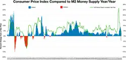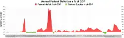 Im Laufe der 1970er Jahre gab es kaum nennenswertes Wachstum der US-Wirtschaft. Der keynesianische Ansatz, der bis dahin dominiert hatte, verlor ab Beginn der 1980er Jahre viele Anhänger. Ronald Reagan gewann die Präsidentschaftswahl 1980 mit dem Wahlspruch „government is not the solution to our problem, government is the problem“[19]. Reagan unterstützte den Ansatz der Angebotspolitik; er senkte ab 1981 Steuern und verringerte staatliche Regulierungen und die Staatsquote. In der Fiskalpolitik bewirkten die Steuersenkungen ein bedeutendes konjunkturunabhängiges deficit spending (die höchste Kreditaufnahme, die die USA in Friedenszeiten bis dahin erlebt hatten).[20] 1982 wuchs das Bruttoinlandsprodukt um zwei Prozent; im Laufe der achtjährigen Amtszeit Reagans wuchs es um 31 %. Während Präsident Bill Clintons Amtszeit wuchs das BIP noch einmal um 38 %. Zum Ende seiner Amtszeit bemaß sich die gesamtwirtschaftliche Produktion auf 9,8 Billionen US-Dollar mit der geringsten Arbeitslosenquote in dreißig Jahren. Mit dem Platzen der Dotcom-Blase begann im Jahr 2000 eine vergleichsweise milde Rezession, die Gesamtwirtschaft hat aber nach fiskal- und geldpolitischen Maßnahmen des Staates und der US-Notenbank schnell wieder an die alten Wachstumsraten angeschlossen. Unter George W. Bush wuchs die Staatsverschuldung dramatisch. Sein Krieg gegen den Terror nach den Anschlägen vom 11. September 2001 (darunter der Irakkrieg) war extrem teuer.