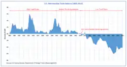 Dessen ungeachtet, überschreitet der Import den Export dauerhaft bei Weitem. Nach Angaben des „US Census Bureau“ beliefen sich die US-amerikanischen Exporte im Februar 2007 auf 124 Mrd. US-Dollar, davon 88,4 Mrd. für Waren und 35,6 Mrd. für Dienstleistungen. Die Importe summierten sich auf 182,4 Mrd. Dollar, davon 152,9 Mrd. für Waren und 29,5 Mrd. für Dienstleistungen. Das Außenhandelsdefizit beträgt damit 58,4 Mrd. Dollar pro Monat. 2006 wurden 1.436,8 Mrd. Dollar exportiert, davon 1.023,7 Mrd. Dollar an Waren und 413,1 Mrd. Dollar an Dienstleistungen. Importiert wurden 2.202,1 Mrd. Dollar, davon 1.859,7 Mrd. Dollar an Waren und 342,4 Mrd. Dollar an Dienstleistungen. Daraus resultiert ein Defizit bei Waren von 836 Mrd. Dollar und ein Überschuss bei Dienstleistungen von 70,7 Mrd. Dollar. Das gesamte Außenhandelsdefizit betrug im Jahr 2006 demnach 765,3 Mrd. Dollar.