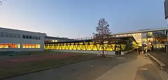 | Ansicht des Schulgebäudes mit dem neu erbauten Turnsaal und einer Zufahrtsstraße. | |
