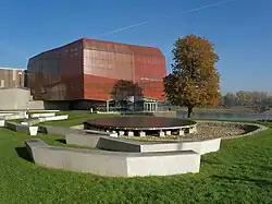 - ein zweigeschossiges Gebäude auf einem L-förmigen Grundriss mit 15.000 m² Nutzfläche für Ausstellungsräume, Labors, einem Konferenzzentrum, einem Restaurant und Café sowie Büroräumen