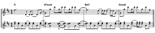 Hörbeispiel: Herunterladen, Informationen, Volles Notenbeispiel) Harmonisches Ostinato (D – A7sus4 – Bm7 – Gsus9) aus dem Solo, welches With or Without You abschließt.Bei seiner Veröffentlichung wurde With or Without You als ein Resultat eines völlig neuen musikalischen Weges angesehen, was sich vor allem auf die Verwendung der infinite guitar zurückführen lässt. Zum Erzeugen der unendlich klingenden Töne nutzte The Edge die von Michael Brook entwickelte Technik (infinite guitar), bei der ein auf das Feedback reagierender elektronischer Sensor die Erzeugung einer beliebig langen Ausklangsphase des Tones samt einer Veränderung der Obertonstruktur mittels eines Equalizers ermöglicht. With or Without You gilt als erster erfolgreicher Song, in dem diese Technik verwendet wird.