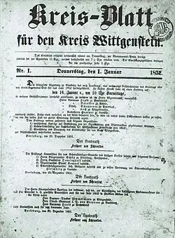 In der ersten Hälfte des 19. Jahrhunderts bestand offenbar kaum ein Bedürfnis für eine eigene Zeitung innerhalb des Kreises Wittgenstein. Aus dem Jahr 1813 sind wenige Nachrichten aus dem Wittgensteiner Land bekannt, die in der Zeitung des Großherzogthums Frankfurt[1] sowie in der Großherzoglich Hessischen Zeitung in Darmstadt veröffentlicht wurden. Die erste Zeitung für den Kreis Wittgenstein war das in Siegen herausgegebene, 1823 gegründete Siegerländer Intelligenzblatt, mit wenigen Nachrichten und einem geringen Anzeigenaufkommen aus Wittgenstein. Als die Zeitung mit Beginn des Jahrgangs 13 im Jahr 1835 ihren Namen in Intelligenzblatt für die Kreise Siegen und Wittgenstein änderte, wurde sie auch in der Region Wittgenstein deutlicher wahrgenommen.[2] Der Anteil der Anzeigen aus Wittgenstein wie auch der dortigen Abonnenten nahm zu. Dennoch konnte die Zeitung sich damals nicht dauerhaft in Wittgenstein behaupten; im Gegensatz zur Gegenwart, in der sie unter dem Namen Siegener Zeitung als auflagenstärkste Tageszeitung im Kreis Siegen-Wittgenstein gilt.
