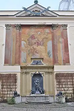 In der Nische des Wandbrunnens befindet sich eine Figurengruppe, die von Franz Xaver Messerschmidt und Johann Martin Fischer geschaffen wurde (Die Kopie der „Witwe“ wurde 1987 von Alfred Zöttl gegossen). Die Frauenfigur hält einen wasserspeienden Krug, während zwei Knaben zu ihren Füßen weitere Gefäße halten bzw. bringen. Der Brunnen wird zu beiden Seiten von auf Sockeln ruhenden Löwenfiguren flankiert, die ebenfalls von Messerschmidt und Fischer stammen. Über dem Brunnen befindet sich die Inschrift „Eliseus machet eine Witwen reich an Öhl IV B K C IV“, ein auf die biblische Witwe von Sarepta bezogener Hinweis auf das 1. Buch der Könige[1] des Alten Testaments. Auf einem kleinen Relief über der Inschrift ist der Prophet Elija zu sehen.