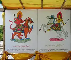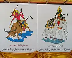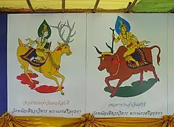 - Freitag: Der Name der Hindu-Gottheit Shukra ist das Sanskrit-Wort für „Reinheit“, „Klarheit“, „Helligkeit“. Er wird in Thailand „Phra Suk“ [] genannt, ein Einsiedler, Gott der Liebe. Er ist das Symbol des Friedens. Sein Element ist das Wasser, die Farbe seines Körpers erinnert an den Sonnenaufgang und er lebt in einer goldenen Behausung. Sein Reittier ist der mythologische Bulle Asupharat (โคอสุภราช), den Shiva für ihn aus 21 Rindern erschuf.
