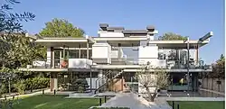 Es ist ein freistehendes Dreifamilienhaus mit Architekturbüro. Cortenstahlstützen und Stahlbetonbalken in einem Rasterabstand von 6 × 6 Metern bilden die Konstruktion des Hauses. Diese tragen allseitig auskragende Sichtbetonplatten. Die aus Stützen, Balken und Platten bestehende Konstruktion ist sichtbar und bildet ein „konstitutives Element der Fassade“.[1] Außerhalb der Glasfassade wurden kubenartig ausgreifende Betonfertigteile eingehängt, die präfabrizierte Sanitärzellen oder Nassräume enthalten und zusätzlichen Nutzraum bieten.[2] Im Sockelgeschoss befindet sich ein Schwimmbad, das zur Landschaft hin offen ist.