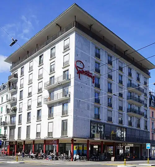 Das Gebäude ist ein würfelförmiger Massivbau mit acht Geschossen und einem weit auskragendem Flachdach. Die Süd- und die Ostseite zeigen jeweils acht Fensterachsen. Die Fenster sind raumhoch. Die Fassaden sind «elegant» mit grauen Platten und weissen Streifenbändern verkleidet. Ihre strenge Rasterung wird durch die unregelmässig angeordneten Balkone in drei verschiedenen Grössen aufgelockert. Jedes Fenster führt mindestens auf einen französischen Balkon. Das Erdgeschoss ist als hoher Laubengang mit Rundstützen ausgeführt. Darüber liegt an der Platzseite ein Restaurant mit breiter Fensterfront. Der Abschluss der Fassade ist in der Art eines Kranzgesimses ausgeführt. Das achte Geschoss ist als Loggia ausgebildet.[1][2]