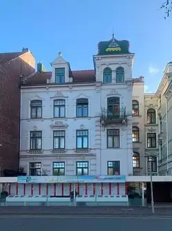 Das viergeschossige traufständige verblendete massive Gebäude mit ziegelgedecktem Satteldach mit bauzeitlicher Gaube sowie mit Neorokoko- und Jugendstil-Elementen wurde 1904 (Inschrift) nach Plänen des Architekten Rudolph Glocke gebaut. Seitlich steht als Risalit ein fünfgeschossiges Türmchen mit geschwungener ziegelgedeckter Glockenhaube und Balkon mit gusseiserner Brüstung. Die Straßenfassade wurde verblendet mit hell glasierten Steinen und Putzdekor wie horizontalen Bändern und Stuckreliefs oberhalb der Fensterumrandungen. Der Eingang befindet sich rechts in einer zurückgesetzten Achse.[2]