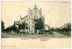 Das dreigeschossige, unter Denkmalschutz stehende[1] Gebäude mit Laden im Stil der Neorenaissance, genauer „stilisiert als deutsche Renaissance in recht freier Auffassung“,[2] ist ein Kopfbau in der Art einer eigentlich geschlossenen Bebauung auf einem spitzwinkligen Grundstück, jedoch folgt hinter dem Bau eine offene Villenbebauung.