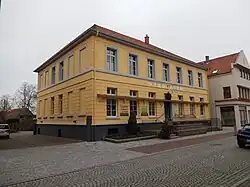 Das zweigeschossige siebenachsige traufständige verputzte klassizistische Gebäude mit Walmdach und mittigem Portal sowie dem geschossteilenden Gesimsband mit der alten Inschrift „Apotheke“ wurde 1841 gebaut.