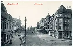 Der Kaufmann Paul Pönitz stellte im April 1912 den Bauantrag für den Eckbau, der an das ihm gehörende Nachbargebäude Bahnhofstraße 8a aus dem Jahre 1898 anschließen sollte. Der Entwurf stammte von dem Baumeister Felix Sommer, der auch die Bauleitung während der Bauausführung innehatte. Die Bezugsgenehmigung für die erste fertiggestellte Haushälfte erging im Februar 1913, der Rest des Gebäudes wurde im September 1913 freigegeben.