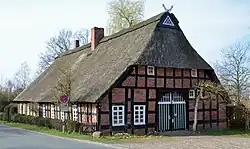 Das eingeschossige Gebäude, ein früheres Hallenhaus in Fachwerk mit Ziegelausfachungen, reetgedecktem Krüppelwalmdach, Niedersachsengiebel mit Uhlenloch und Pferdeköpfen am Dachfirst sowie der Grooten Door mit Korbbogen an der Giebelseite wurde 1735 (Inschrift) gebaut. Das ehemalige, sanierte Bauernhaus steht direkt neben der alten Wassermühle Barrien.