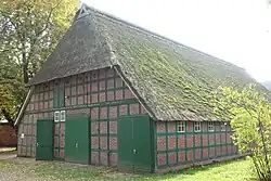 Das eingeschossige traufständige Zweiständer-Hallenhaus in Fachwerk mit Steinausfachungen, ziegelgedecktem Krüppelwalmdach, Uhlenloch, Ladeluke und Grooter Door mit geradem Abschluss wurde 1849 für Johann Klee und Ehefrau Marie (Inschrift) gebaut.[1]