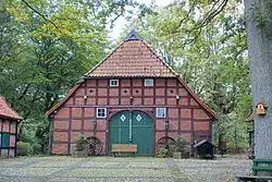 Das eingeschossige giebelständige Wohn- und Wirtschaftsgebäude als Zweiständer-Hallenhaus in regelmäßigem Fachwerk mit Steinausfachungen, ziegelgedecktem Krüppelwalmdach mit Uhlenloch und Grooter Door mit Korbbogen wurde 1831 (Inschrift) gebaut.[2]