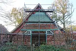 Das eingeschossige traufständige Wohn- und Wirtschaftsgebäude als Zweiständer-Hallenhaus in Fachwerk mit Steinausfachungen, ziegelgedecktem Satteldach, regionaltypischer senkrechter Verbretterung in den oberen Giebeldreiecken und der Grooten Door mit geradem Abschluss, wurde um 1800 als Häuslingshaus gebaut.[1]