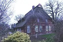 Das eingeschossige giebelständige Wohn- und Wirtschaftsgebäude als Zweiständer-Hallenhaus in Fachwerk mit Steinausfachungen, mit südöstlichem Wirtschaftsteil mit niedrigerer Firsthöhe als der Wohnteil an der Hauptstraße, mit reetgedecktem Krüppelwalmdach und Niedersachsengiebel mit Uhlenloch und niedersächsischen Pferdeköpfen, der Grooten Door mit Rundbogen, stammt von 1769 (Inschrift). Es ist eines der älteren Hallenhäuser des Landkreises. Das Gebäude wurde saniert.[1]