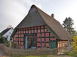 Das giebelständige Hallenhaus in Fachwerk mit Steinausfachungen, reetgedecktem Krüppelwalmdach, Niedersachsengiebel mit Uhlenloch und Inschrift im Giebelbalken über der Grooten Door wurde 1831 für die Familie Dannemann gebaut. Bemerkenswert ist das enge Raster des Fachwerks.