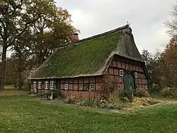 Das eingeschossige giebelständige Wohn- und Wirtschaftsgebäude als Zweiständer-Hallenhaus in Fachwerk mit Steinausfachungen, reetgedecktem Krüppelwalmdach, Niedersachsengiebel mit Uhlenloch, Pferdeköpfen und der Grooten Door mit Korbbogen, wurde 1840 (Inschrift) gebaut. Im Inneren blieb das Gerüst und das bauzeitliche Kieselflett (Küche mit früher offener Feuerstelle) erhalten. An den seitlichen Wänden wurden Veränderungen am Fachwerk vorgenommen.[1]