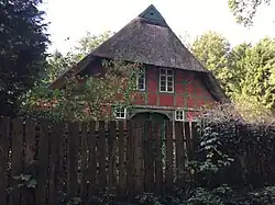 Das eingeschossige, giebelständige Gebäude als Zweiständer-Hallenhaus in Fachwerk mit Steinausfachungen, reetgedecktem Walmdach (am Wohngiebel als Krüppelwalm), Uhlenloch und Grooter Door mit Korbbogen, wurde im 19. Jahrhundert gebaut.[1]