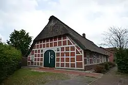 Das eingeschossige traufständige Wohn- und Wirtschaftsgebäude als Zweiständer-Hallenhaus, in Fachwerk mit Steinausfachungen, reetgedecktem Krüppelwalmdach, Uhlenloch und der Grooten Door mit Korbbogen wurde um 1850 (a) oder 1889 (Inschrift) gebaut.[1]
