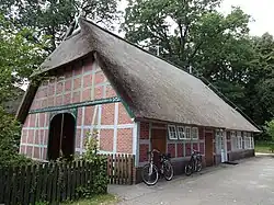 Das eingeschossige giebelständige Wohn- und Wirtschaftsgebäude als Zweiständer-Hallenhaus in Fachwerk mit Steinausfachungen, reetgedecktem Krüppelwalmdach, Niedersachsengiebel mit Uhlenloch, Pferdeköpfen und der Grooten Door mit Korbbogen, wurde 1846 (Inschrift) erbaut. Der Wohngiebel wurde teilweise massiv ersetzt. Das Haus wurde zu einem Kindergarten umgebaut.[1] Ein Stolperstein erinnert an das Schicksal von Anna Katharina Meyer (1901–1941), die seit 1934 in einer Heilanstalt in Lüneburg lebte und in der NS-Zeit als Euthanasie-Opfer ermordet wurde.