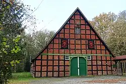 Das eingeschossige giebelständige Zweiständer-Hallenhaus in gleichmäßigem Gitterfachwerk mit Steinausfachungen, ziegelgedecktem Satteldach und Grooter Door mit Korbbogen, wurde 1882 (Inschrift) gebaut.[1]
