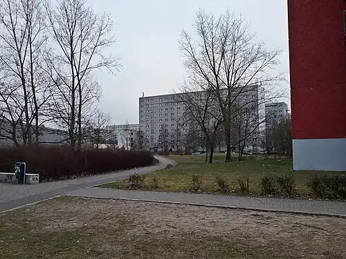 Im Wohngebiet entstanden 2581 Wohnungen und 17 gesellschaftliche Einrichtungen sowie eine kleine Volkshochschule. 662 Wohnungen der elfgeschossigen WBS 70-Serie, 662 Wohnungen der zehngeschossigen QP 71-Serie und 550 Wohnungen der WBS 70-Serie mit sechs Etagen. Außerdem errichteten thüringische Bauunternehmen aus Gera sechsgeschossige Mittelganghäuser mit 355 Wohnungen. Bis zum Jahr 1983 waren über 84,4 % der Wohnungen fertiggestellt. Ein kleines gesellschaftliches Zentrum mit eingeschossiger Kaufhalle in Stahlleichtbauweise und einer vom Hochbau Nordhausen errichteten Gaststätte mit 185 Plätzen entstand zwischen der Wuhlestraße und der Garzauer Straße und wurde nach der politischen Wende umgenutzt: das Einkaufs- und Dienstleistungszentrum wurde modernisiert und umgebaut, die ehemalige Gaststätte wurde durch einen Um- und Anbau erweitert. Der neue Verbrauchermarkt hat eine Fläche von 1500 m² und es entstanden ein Backwarenladen, ein Textilladen sowie eine Bowlingbahn. Gastronomische Einrichtungen und Arztpraxen sollen im zweigeschossigen Anbau Platz finden.