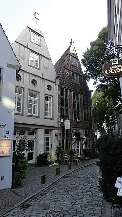 Das Haus hat als direkte Nachbarn das Concordenhaus (rechts) und das Teestübchen im Schnoor (links).