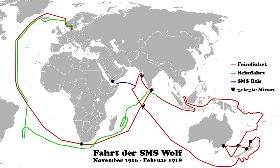 Am 30. November 1916 lief die Wolf unter dem Kommando von Fregattenkapitän Karl August Nerger mit 348 Mann Besatzung vom Skagerrak aus an der norwegischen Küste entlang in den Nordatlantik, umfuhr Island nördlich durch die Dänemarkstraße und ging anschließend auf Südkurs. Nach der Fahrt durch den Nord- und Südatlantik umrundete sie das Kap der Guten Hoffnung, wo sie Minen legte, und durchfuhr dann den Indischen Ozean mit Ziel südasiatische Küste. Dort legte sie Minen vor den Häfen von Bombay und Colombo, bevor sie in den Gewässern Südostasiens, Australiens und Neuseelands mittels ihres Bordflugzeugs Wölfchen gegnerische Schiffe ausfindig machte, die sie später aufbrachte und versenkte (35 Handelsschiffe und zwei Kriegsschiffe mit zusammen zirka 110.000 BRT). Als Piloten waren Leutnant z.S.d.R. Alexander Stein und Oberflugmeister Paul Fabeck mit an Bord.