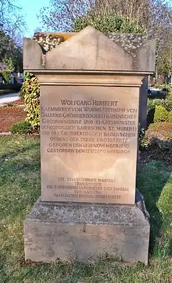Wolfgang Heribert von Dalberg und seine Frau wurden auf dem römisch-katholischen Friedhof in Mannheim, K 2, beigesetzt. Bei dessen Auflösung wurden die sterblichen Überreste und das klassizistische Grabmal auf den Hauptfriedhof Mannheim überführt, der Stein 1977 restauriert.[25][Anm. 8]